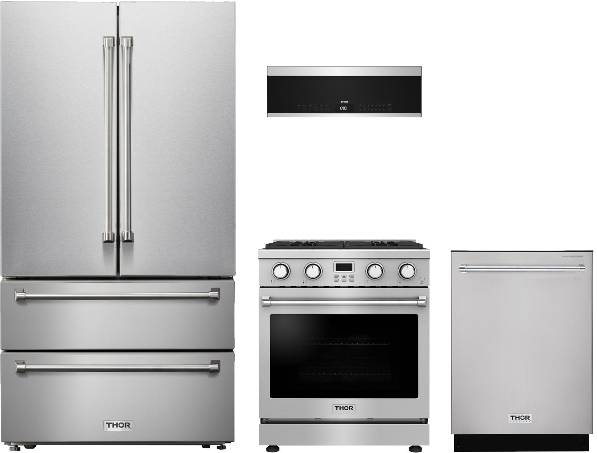 Thor Kitchen® 4 Piece Stainless Steel Kitchen Package with a freestanding gas range, French door refrigerator, built in dishwasher and over the range microwave.Read More